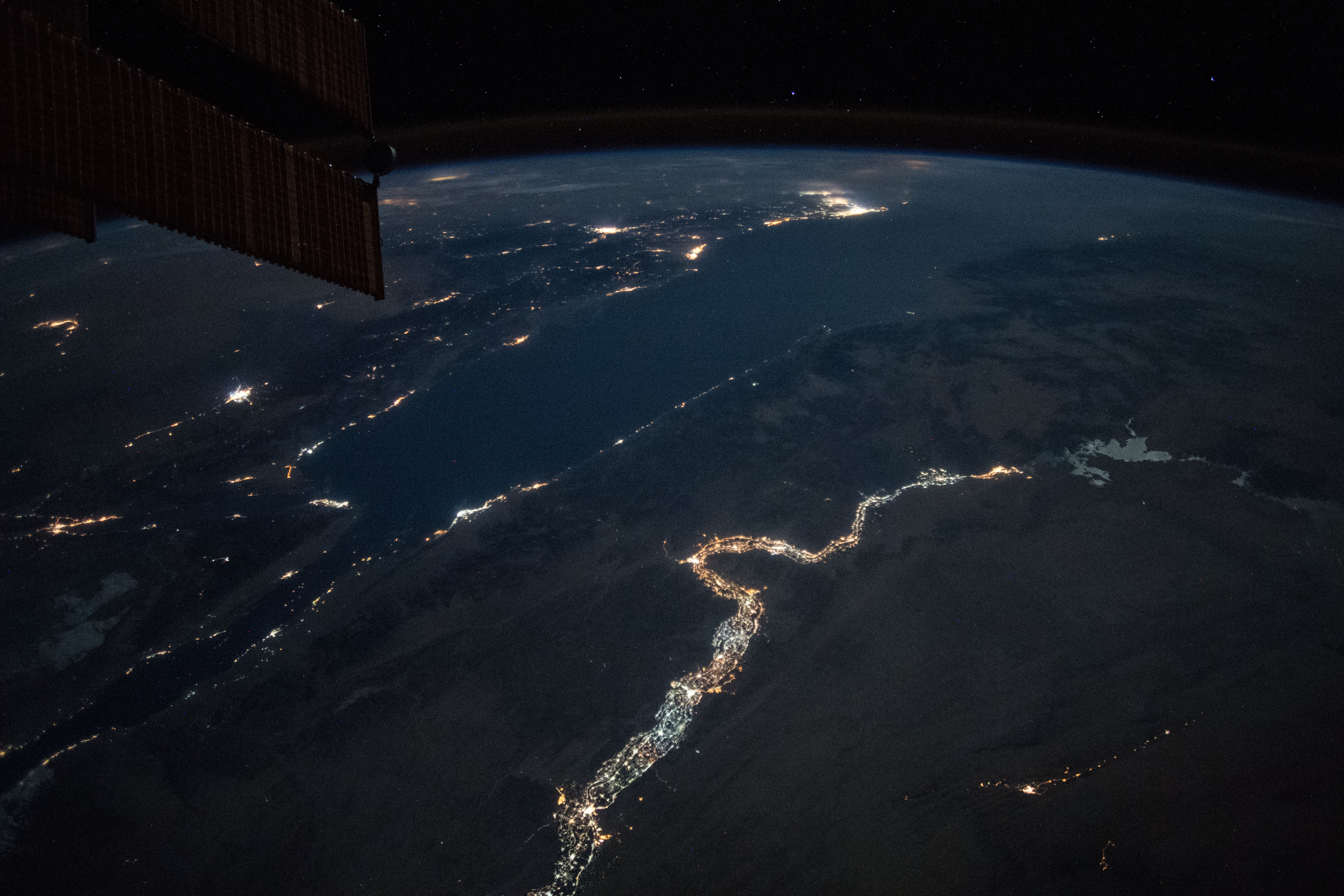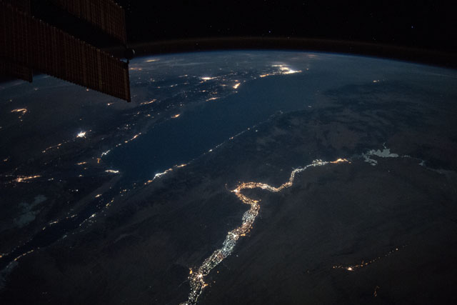 Features: | NILE RIVER, NUBIAN DESERT, NASSER LAKE, EASTER DESERT, RED SEA, GULF OF SUEZ, GULF OF AQABA, NIGHT, EARTH LIMB |