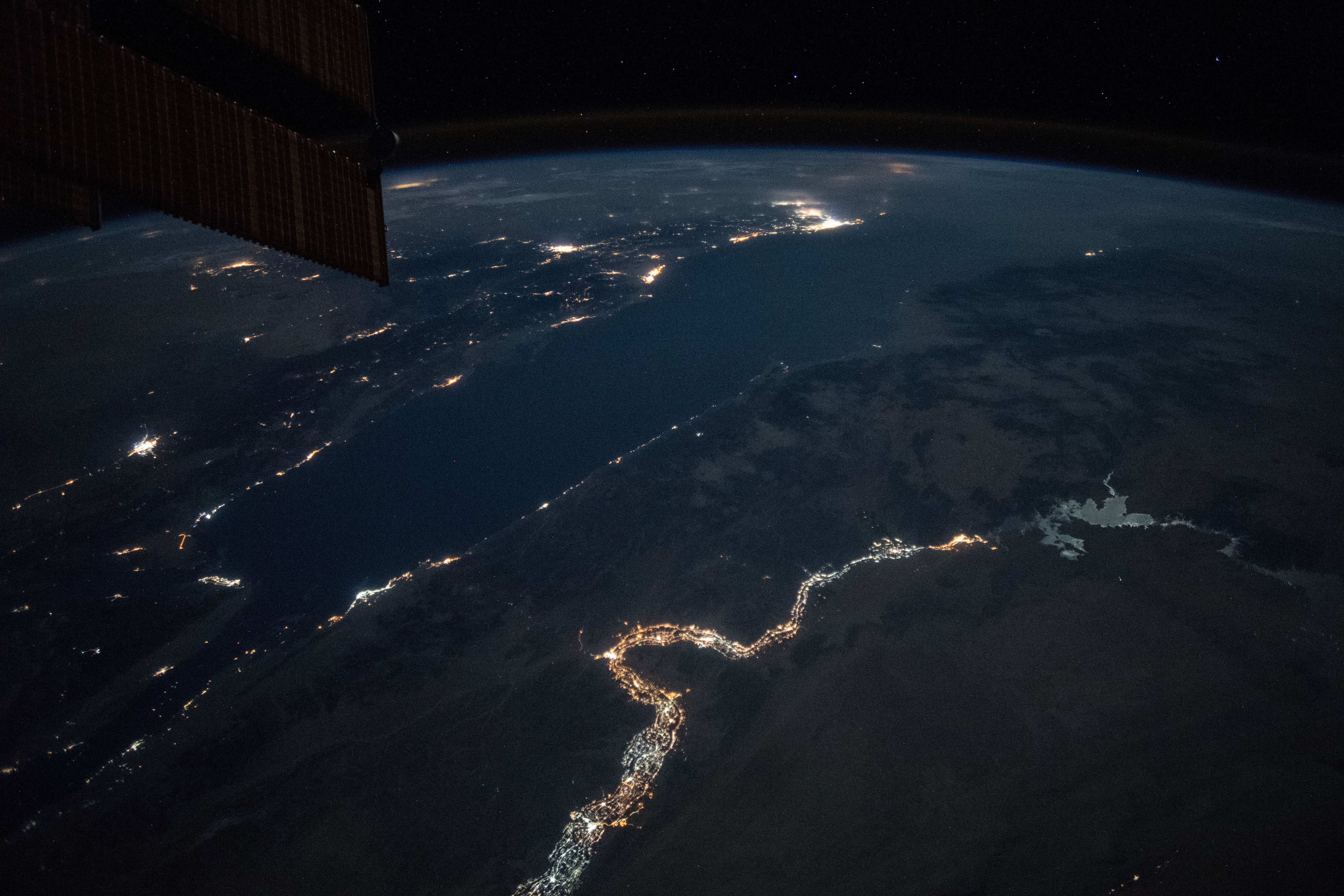 Features: | NILE RIVER, NUBIAN DESERT, NASSER LAKE, EASTER DESERT, RED SEA, GULF OF SUEZ, GULF OF AQABA, NIGHT, EARTH LIMB |