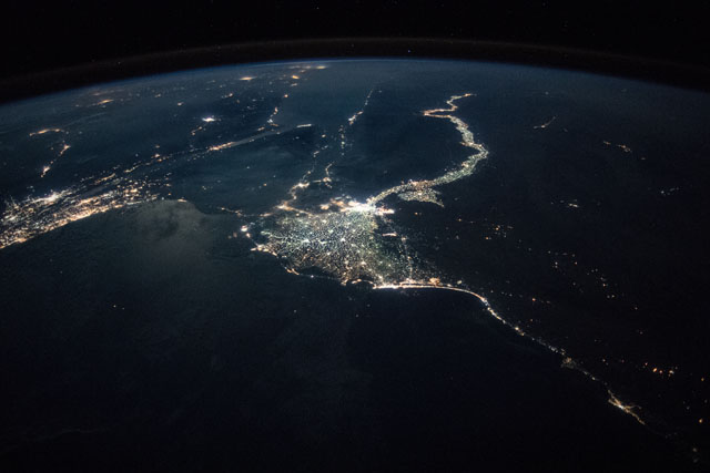 Features: | CAIRO CITY, GULF OF SUEZ, GULF OF AQABA, NEGEV DESERT, SUEZ CITY, ISMAILIA CITY, PORT SAID CITY, NILE DELTA, FAIYUM CITY, WESTERN DESERT, NIGHT, EARTH LIMB |
