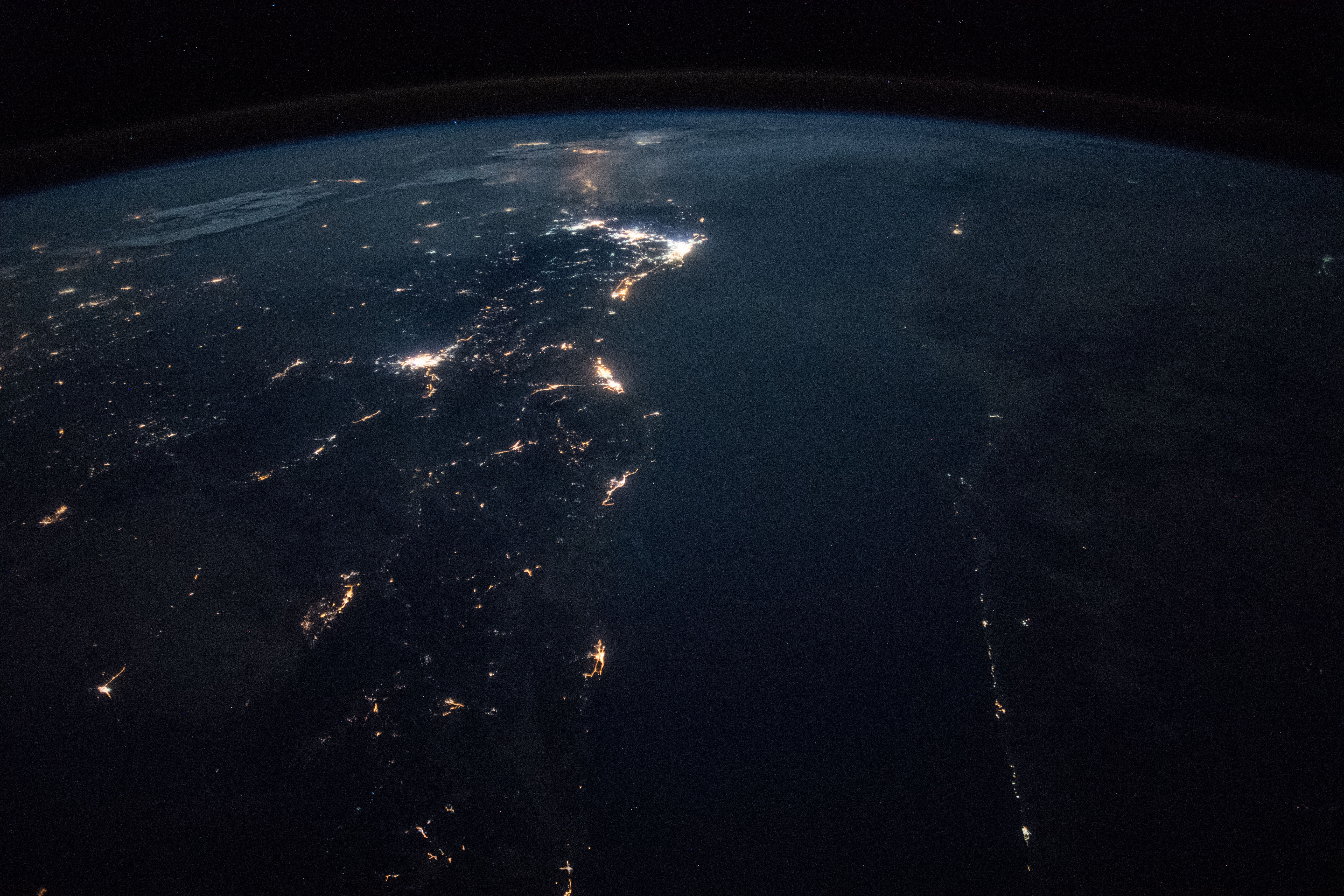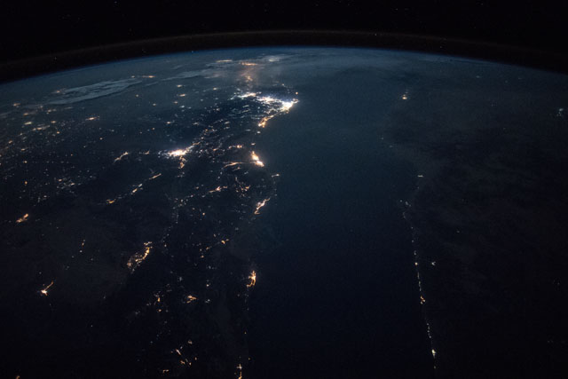 Features: | HEJAZ MOUNTAINS, RED SEA, EASTERN DESERT, AL WAJH CITY, JEDDAH CITY, YANBU CITY, NIGHT, EARTH LIMB |