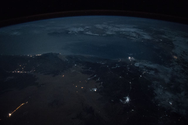 Features: | GULF OF ADEN, SANA'A CITY , TAIZZ CITY, AL HABILAYN CITY, ARABIAN SEA, HADHRAMAUT MOUNTAINS, NIGHT, EARTH LIMB |