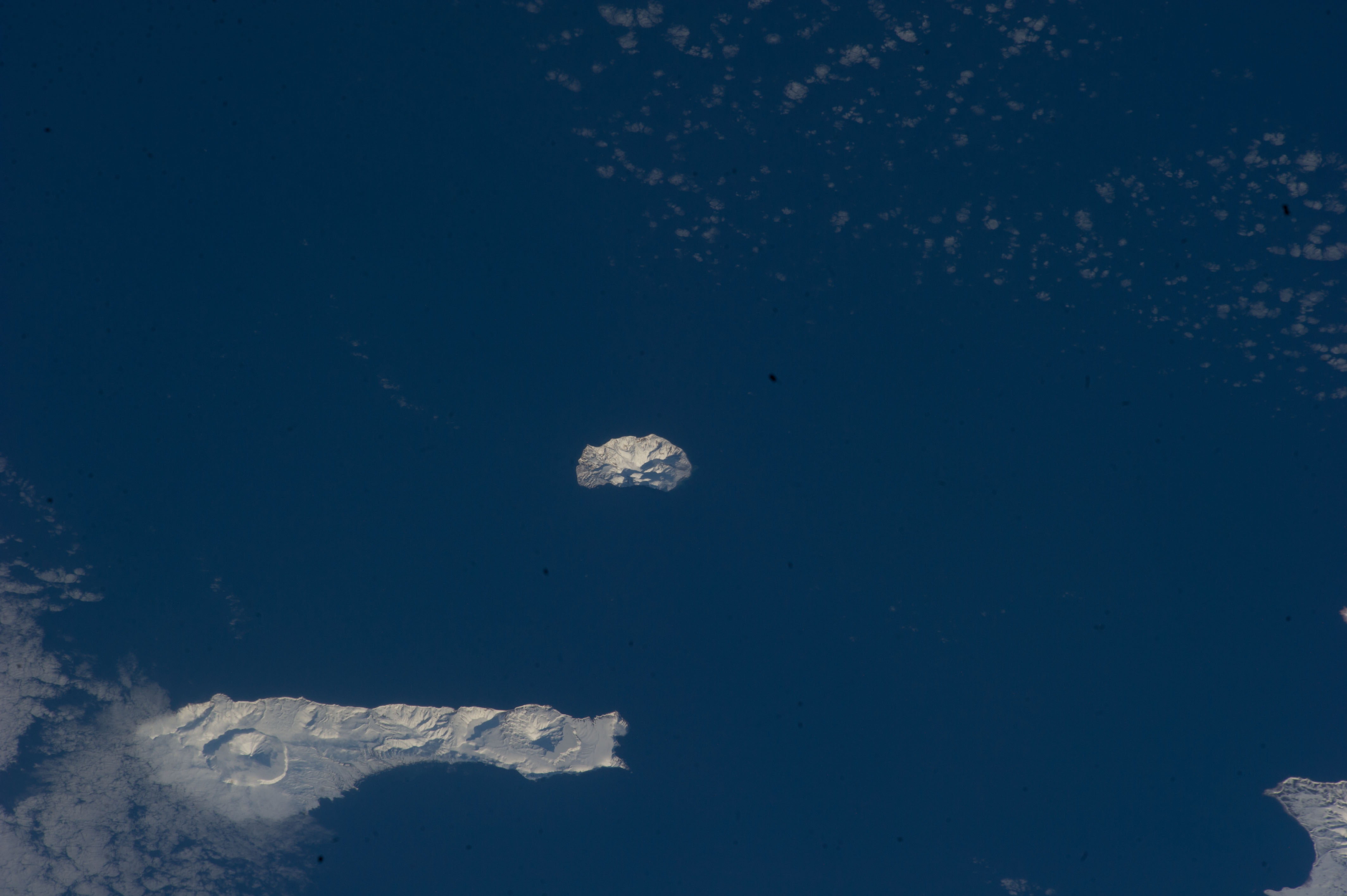 Features: | FUSSA VOLCANO, CHIKURACHKI VLCANO, LUZHIN STRAIT, COASTLINE |
