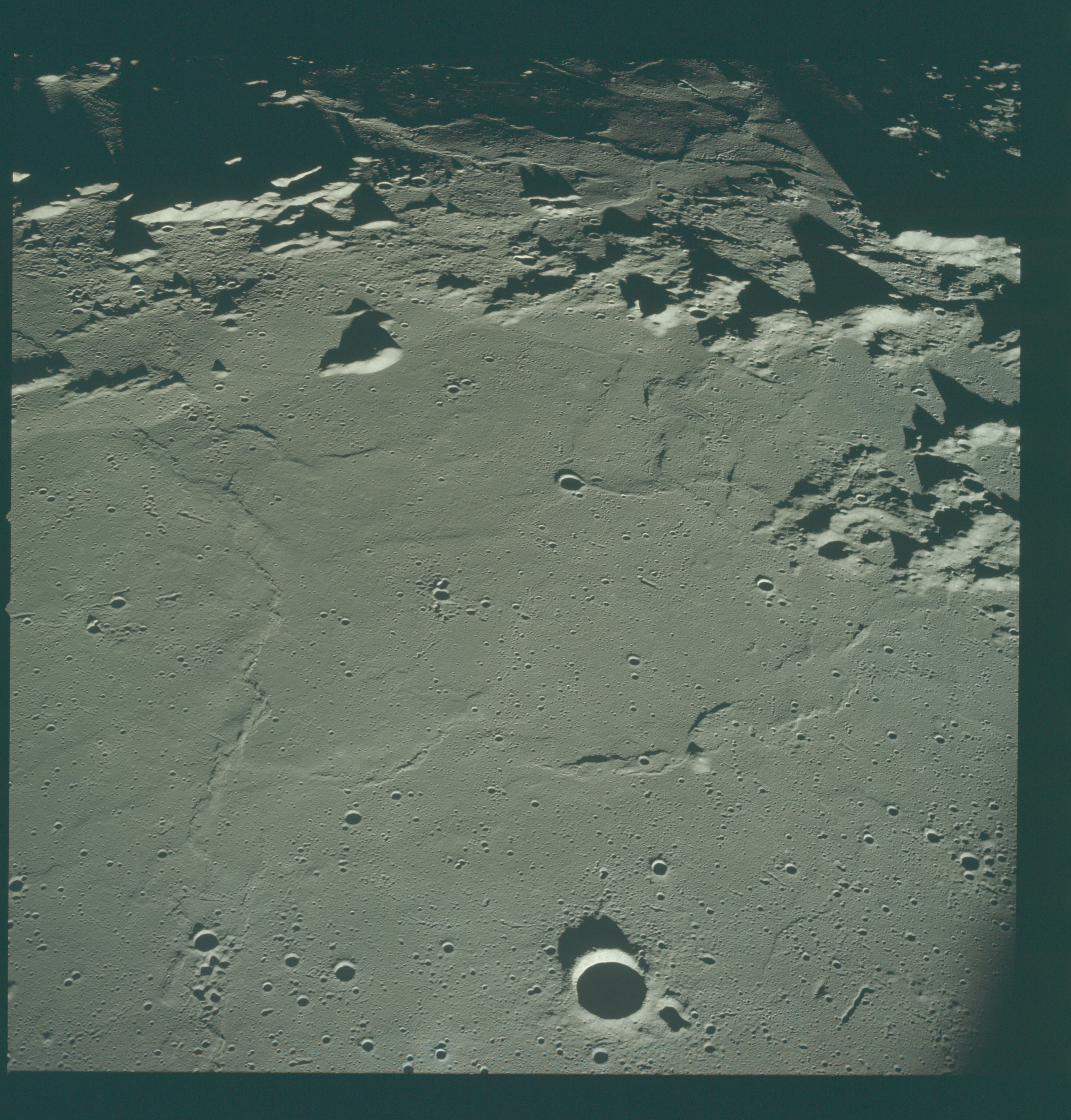 No GeoTIFF is available for this photo.Image Caption: Apollo 10 westward view across Apollo Landing Site 3 in the Central Bay. Apollo Landing Site 3 is in the middle distance at the left margin of the pronounced ridge in the left half of the photograph. Bruce, the prominent crater, near the bottom of the scene, is about 6 kilometers (3.7 statute miles) in diameter. Topographic features on the surface of the Central Bay are accentuated by the low sun angle. Sun angles range from near 6 degrees at the bottom of the photograph to less than 1 degree at the top.