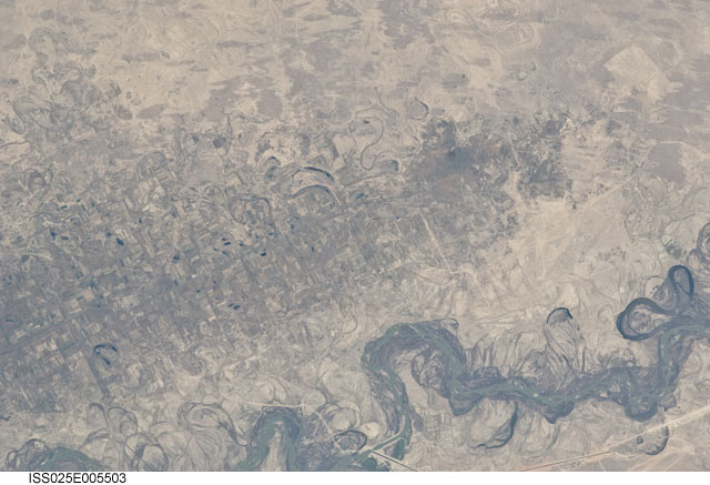 Features: | SYRDAR'YA RIVER VALLEY, AGR., CANALS, LAKES, VILLAGES, DESERT STEPPE, DUNES |