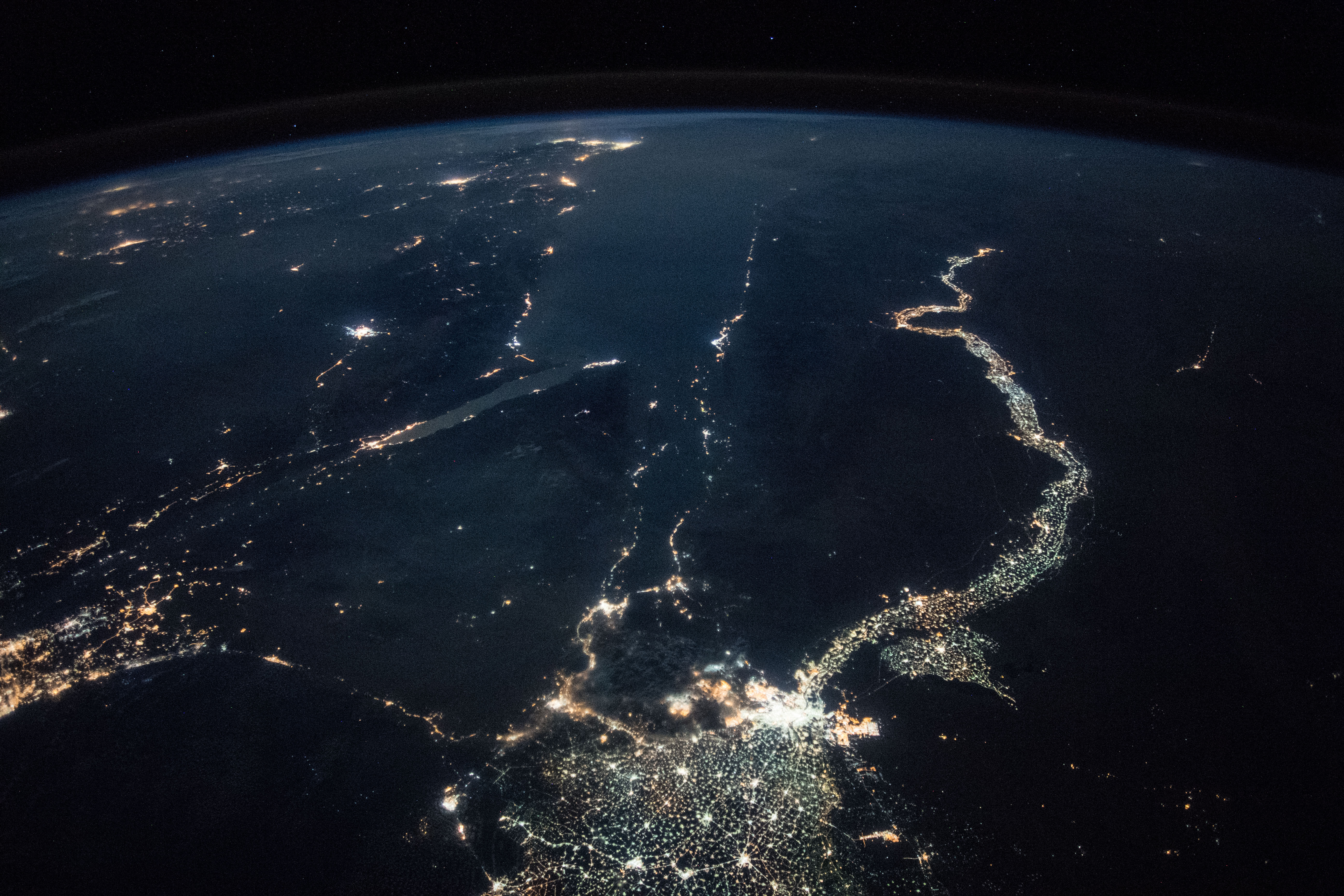 Features: | CAIRO CITY, GULF OF SUEZ, GULF OF AQABA, NEGEV DESERT, SUEZ CITY, ISMAILIA CITY, PORT SAID CITY, NILE DELTA, FAIYUM CITY, WESTERN DESERT, NIGHT, EARTH LIMB |