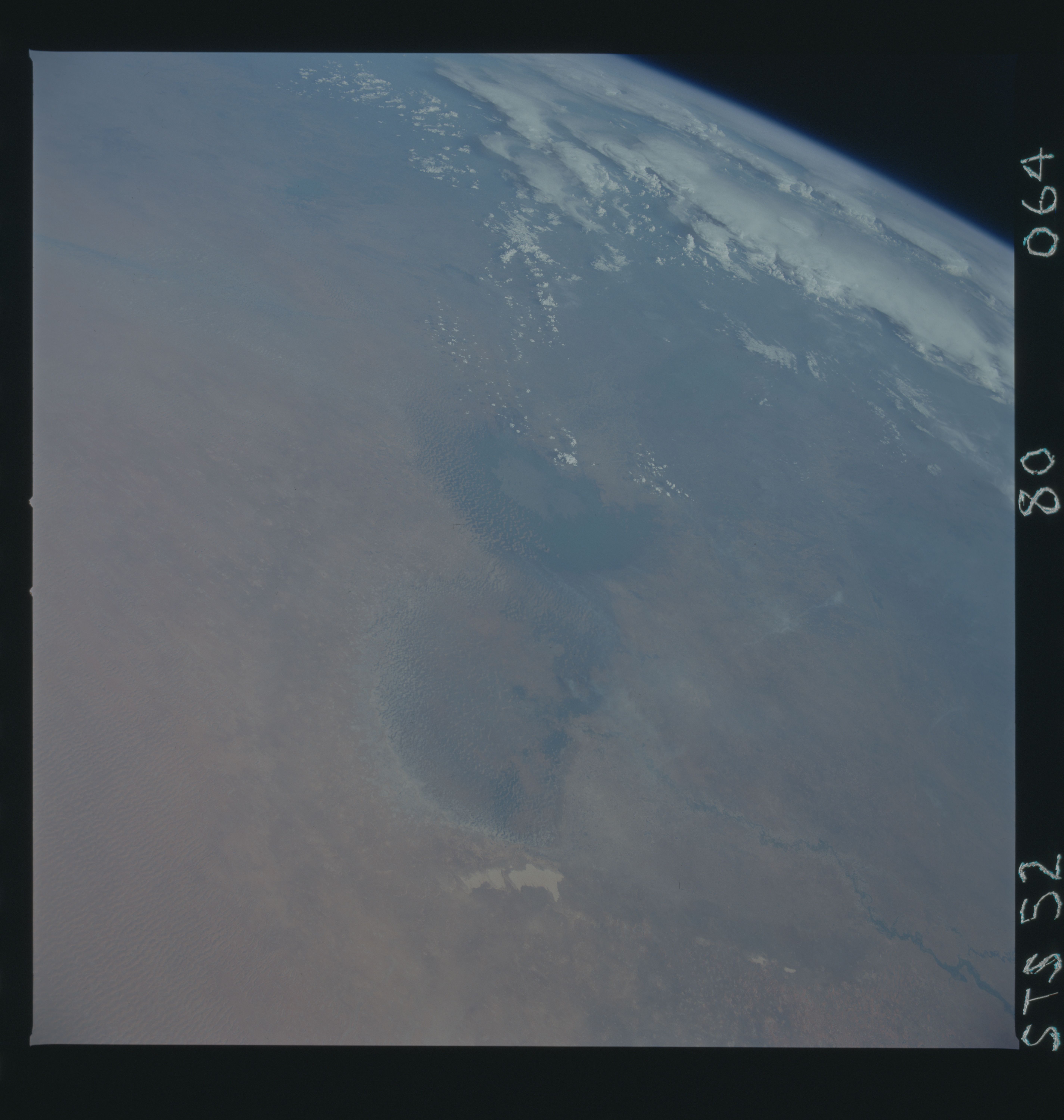 No GeoTIFF is available for this photo.Image Caption: Hydrologic and ecologic changes in the Lake Chad Basin are shown in this Oct 1992 photograph. In space photo documentation, Lake Chad was at its greatest area extent (25,000 sq. km.) during Gemini 9 in June 1966 (see S66-38444). Its reduction during the severe droughts from 1968 to 1974 was first noted during Skylab (1973-1974). After the drought began again in 1982, the lake reached its minimum extent (1,450 sq. km.) in Space Shuttle photographs taken in 1984 and 1985. In this STS-52 photograph, Lake Chad has begun to recover. The area of the open water and interdunal impoundments in the southern basin (the Chari River Basin) is estimated to be 1,900 to 2100 sq. km. Note the green vegetation in the valley of the K'Yobe flow has wetted the northern lake basin for the first time in several years. There is evidence of biomass burning south of the K'Yobe Delta and in the vegetated interdunal areas near the dike in the center of the lake. Also note the dark "Green Line" of the Sahel (the g
