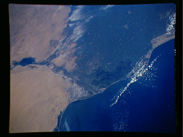 No GeoTIFF is available for this photo.Image Caption: STS-56 Earth observation of the northeastern Nile Delta was photographed from the Earth-orbiting Discovery, Orbiter Vehicle (OV) 103. The branch of the Nile featured in the frame is Daimietta. The Suez Canal marks the boundary of the Nile Delta agriculture and the Sinai Desert to the right. Lake Masada, the dark waterlogged area to the west (left) of Port Said is becoming more saline as the Aswan Dam has reduced sediment downstream. This sediment reduction, according to NASA scientists studying the STS-56 photography, has resulted in increased coastal erosion and the intrusion of a salt-water lens to the ground water, particularly in the northeastern portions of the delta. Center pivot irrigation fields are located along either side of the Ramses Canal, which connects the Daimietta Nile with Great Bitter Lake. This canal has been re-dug three or four times in the past 3,000 years. Historians note that the canal's most famous use was as the departure point of the fleet of Pharaoh Necho.