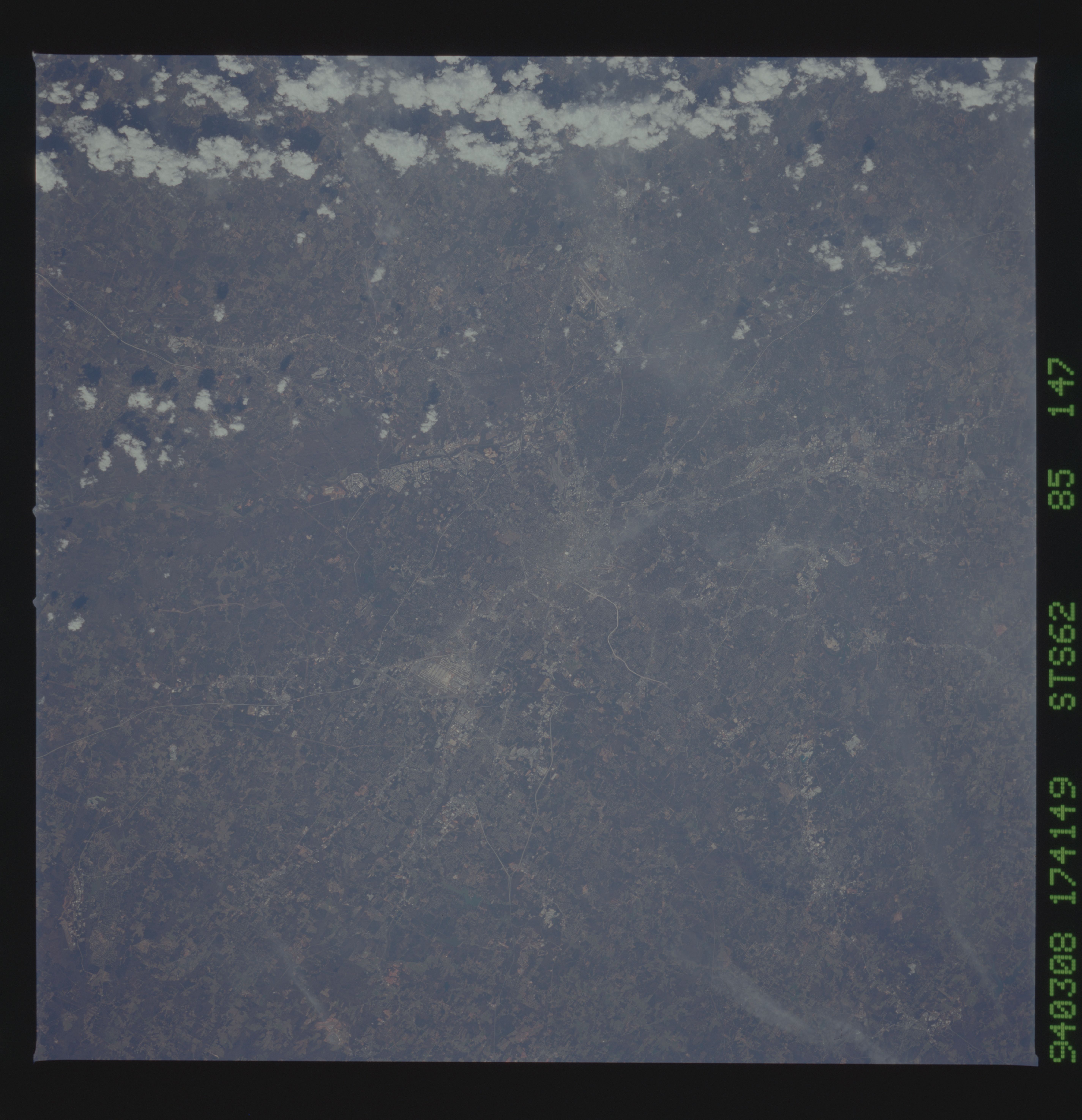 No GeoTIFF is available for this photo.Image Caption: Hartsfield Atlanta International Airport is visible to the south of Atlanta, situated near the center of the photograph. Dobbins Air Force Base and the city of Marietta can also be seen to the north of Atlanta in this south-looking low-oblique view. The complex system of transportation routes and interstate highways surrounding and traversing Atlanta can also be seen in the photograph. The white dot near the center of the photograph is the Georgia Dome, a major sports and entertainment complex in downtown Atlanta. The Stone Mountain Memorial, with its enormous relief carvings of Confederate figures, is located east of Atlanta and is visible on the photograph.