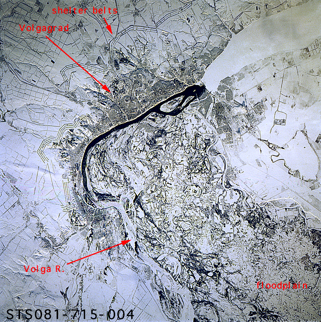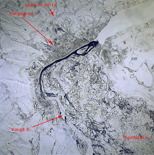 Contrast in brightness shows up many features in this near-vertical view of the great bend of the Volga River--dark, open strip of water, center. The Volga flows south into the view from top right, then southeast from the center to the bottom. Volgograd appears as the grey zone along the left (west) side of the open water. Presumably the icefree part of the river opposite Volgograd relates to the slightly warmer water which is spilled from prominent, ice-covered Lake Volgograd (top right). The wide patterns of swirls, center to lower right, are numerous meander bends on the Volga's floodplain (up to 20 miles wide), highlighted by snow. The main course of the Volga is once again ice covered in this floodplain belt. The Volga-Don Canal can be seen leaving the river just south of the bend, exiting the view center left. This canal, with others in the Moscow region, allows barge traffic to move through the Russian heartland, from the Black Sea to the Baltic at Leningrad. The long parallel lines in threes and fours are lines of trees used as wind breaks. They stretch across Russia for hundreds of miles.